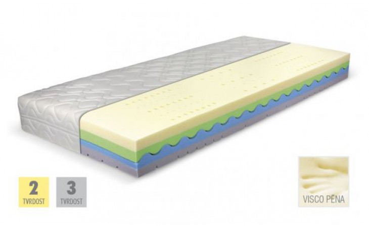 Vysoce luxusní matrace DPV AKASHA kombinovaná z kvalitních studených HR pěn a roznášecí vrstvy z VISCO pěny. Jádro je tvořeno zámkovým spojem ze dvou kvalitních studených pěn (40 kg/m3 a 38 kg/m3). Jedna strana matrace nabízí vysokou vrstvu VISCO elastické pěny, ve které jsou nejnovější technologií „ŘEŠETO“ vytvořeny otvory, a to, až do středu základního jádra. Díky propojení vertikálních a horizontálních otvorů je jádro dokonale prodyšné. Druhá strana matrace nabízí roznášecí vrstvu z HR studené pěny (35 kg/m3) s antidekubitním prořezem, kde příčné a podélné profilování povrchu jádra lépe kopíruje tvar těla. Matrace je opatřena pratelným, zónově prošitým potahem. Potah – úplet, možnost výměny potahu za Dry fast argentum = 550 Kč do rozměru 90×200, u větších rozměrů cena na dotaz. Celková výška matrace v potahu je cca 19 cm. Matrace je vhodná na pevný a polohovací lamelový rošt a je určena pro váhovou kategorii do 130 kg.