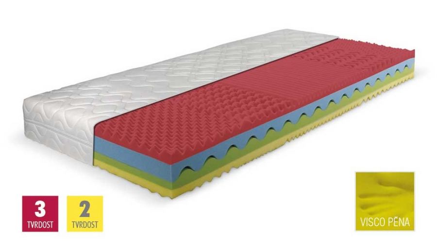 5-zónová luxusní matrace, jejíž jádro je složeno ze dvou vysoce kvalitních studených pěn (HR 40 a 38 kg / m³) spojených zámkovým spojem. Jedna strana matrace nabízí vrstvu VISCO pěny s výraznou profilací povrchu, která zajišťuje správný a zároveň velmi kvalitní spánek. Druhá strana nabízí roznášecí vrstvu z antibakteriálního pěny, která eliminuje výskyt roztočů a má vynikající odolnost proti vzniku plísní. Matrace má pratelný, zónově prošitý potah z úpletu. Celková výška matrace v potahu je cca 18 cm. Matrace je vhodná na všechny typy lamelových roštů a je určen pro váhovou kategorii do 130 kg.