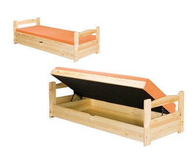 Lůžko Mabor o rozměru 90 x 200 cm s úložným prostorem. Výška při otevření postele je 80 cm. Vyrobeno z borovicového masivu. V ceně postele je i matrace. Uvedená cena platí pro přírodní provedení.